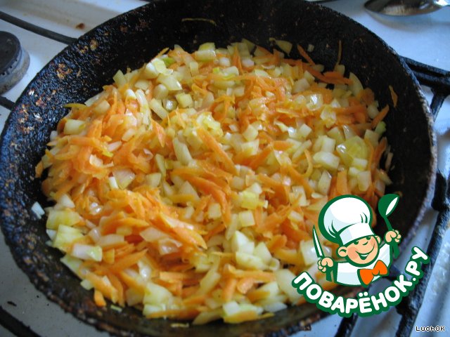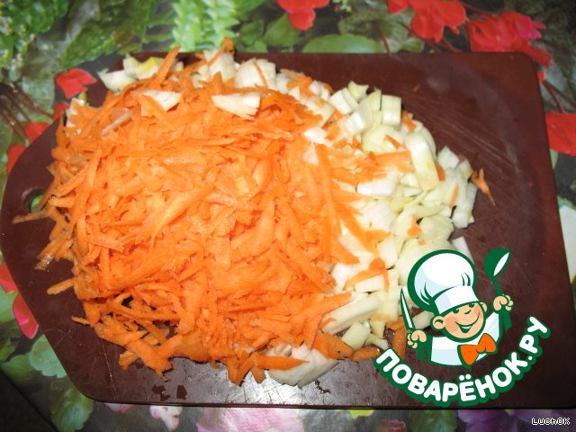 | Когда бульон уже почти готов, трём на крупной тёрке морковку, а лук мелко нарезаем |