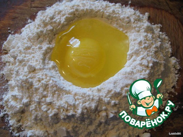 | Высыпаем кучкой на доску. Делаем в центре углубление и разбиваем туда одно яйцо. |