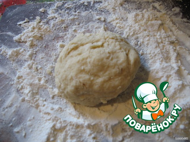| Добавляем 1 стол.ложку воды и щепотку соли. Замешиваем крутое тесто. Тесто должно получится как для пельменей. Даём ему постоять несколько минут. |