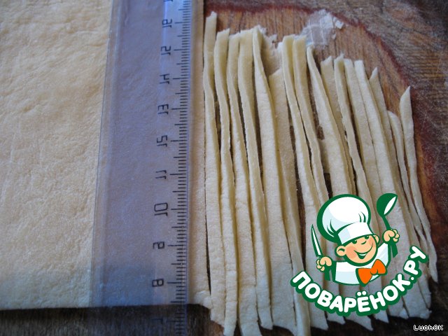 Вообще для нарезания лапши существуют специальные приспособления. Но поскольку у меня их нет (сколько раз просила мужа подарить мне лапшерезку на 8 марта!), то я нарезаю лапшу тупо по линейке!  |